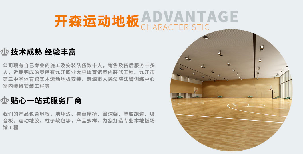 九江開森地板有限公司位于美麗的江西省九江市。地板原材料采自于吉林,黑龍江等長白山地區自家承包林場的優質木料,主,輔龍骨采用美國進口花旗松為原料。開森地板擁有雄厚的科技和研發實力,匯集了一批優異工程師和專業的安裝團隊,引進的進口地板安裝設備。本公司對外承攬大、中、小體育場館的運動木地板安裝工程。做到質量保證、價格合理。在行業內擁有較高的知名度,實力迎合市場!